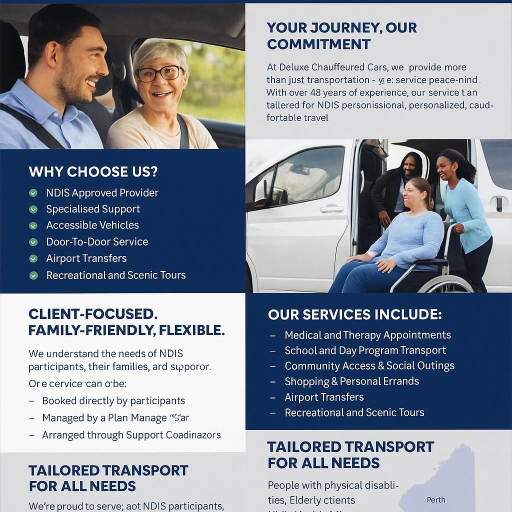 At Deluxe Chauffeured Cars (DCC), we are proud to be a registered NDIS provider, offering professional and reliable transport services designed to meet the unique needs of individuals with disabilities. We understand the importance of comfort, safety, and flexibility, ensuring that each client receives a personalised and supportive experience.